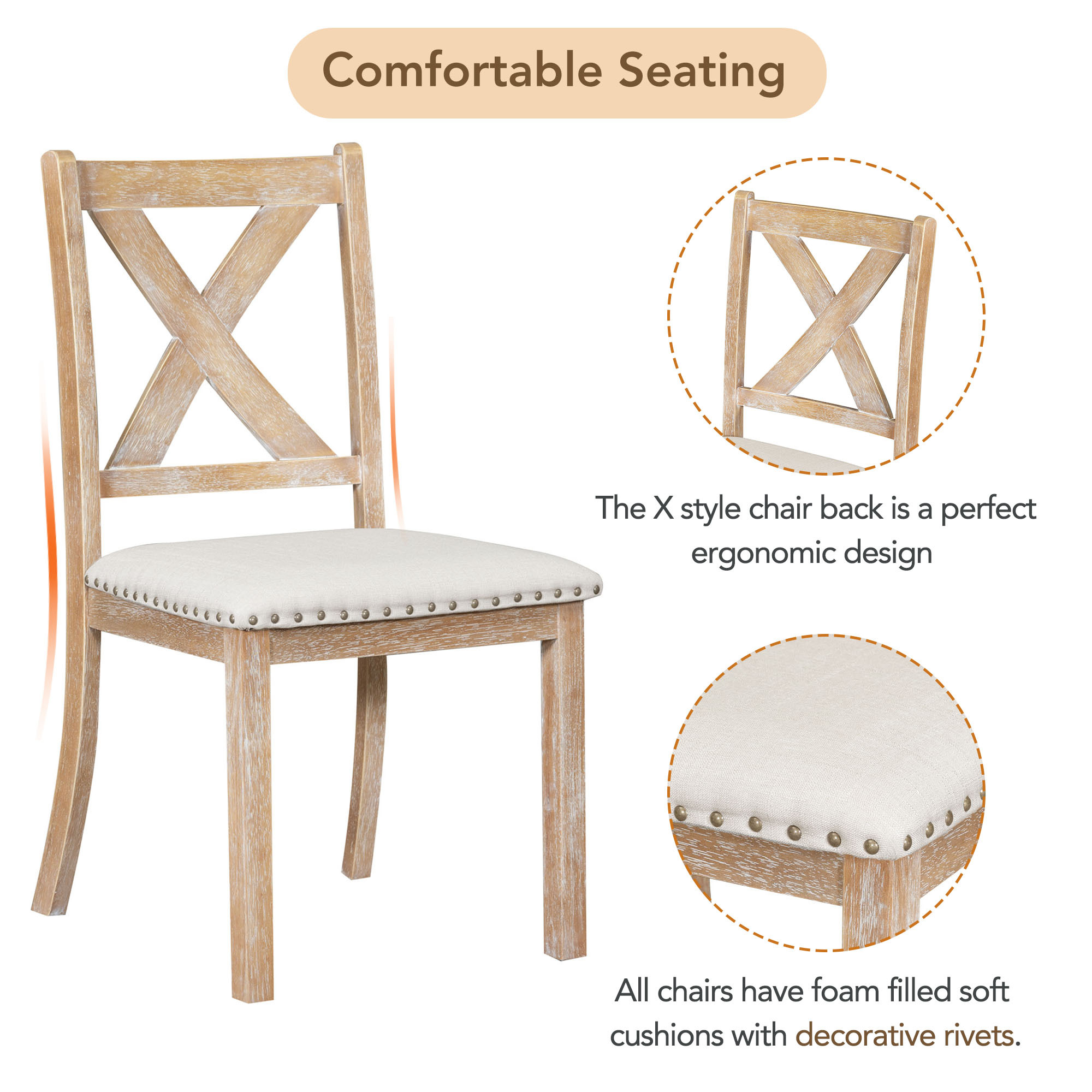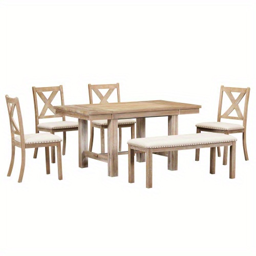 Thompson 6-Piece Farmhouse Dining Set- 82" Extendable Table with Footrest, 4 Upholstered Chairs & Bench, Natural beige Cushions